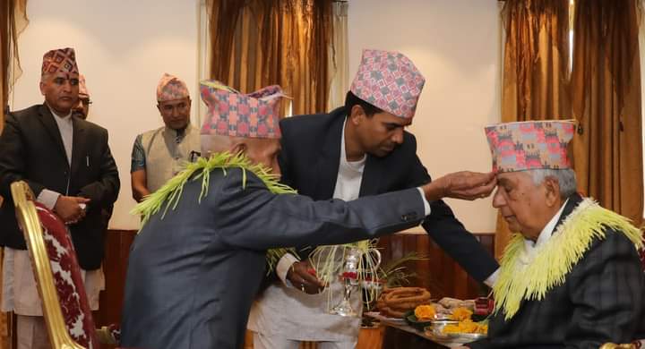 राष्ट्रपति पौडेलले दाजुद्वारा बडादसैँको टीका ग्रहण, राष्ट्रपतिले विशिष्ट देखि सर्वसाधारणलाई टीका लगाइदिने कार्यक्रम