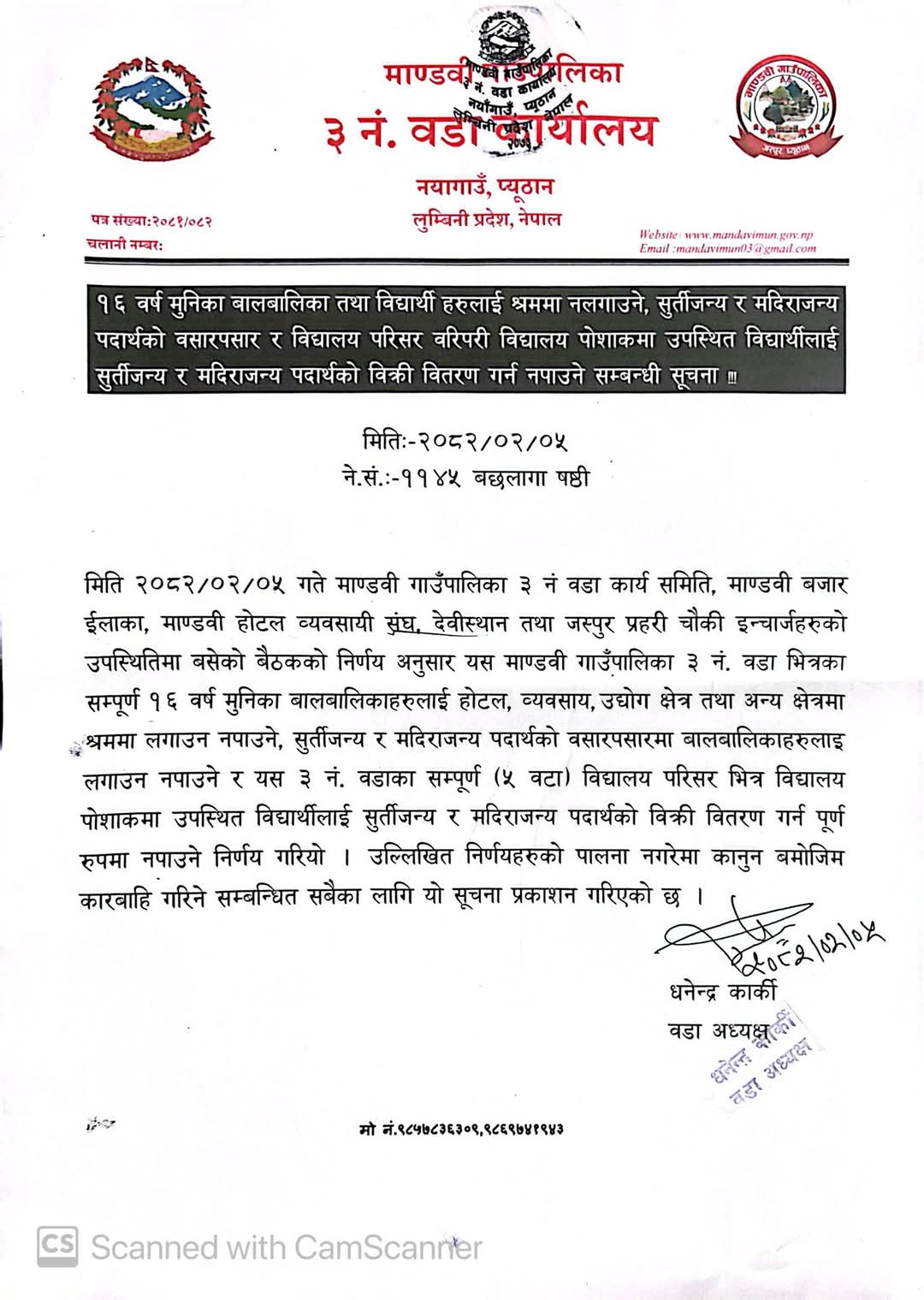 प्यूठान । माण्डवी गाउँपालिका-३ मा बालबालिका तथा विद्यालय पोसाकमा रहेका विद्यार्थीलाई मदिरा र सुर्तीजन्य पदार्थ किनबेच गर्न रोक लगाईएको छ।