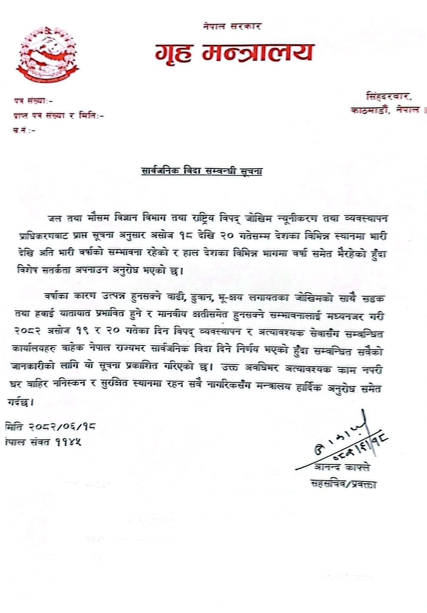 काठमाडौं । सरकारले आज (आइतबार) असोज १९ गते र भोलि (सोमबार) २० गते दुई दिन सार्वजनिक बिदा दिने निर्णय गरेको छ । देशभर आएको अविरल वर्षासँगैको प्रतिकूल अवस्थालाई मध्यनजर गर्दै थप दुई बिदा दिने निर्णय भएको गृह मन्त्रालय स्रोतले जानकारी दिएको छ । दशै पछि सरकारी कार्यालयहरू भोलिदेखि खुल्ने तय भएको थियो ।