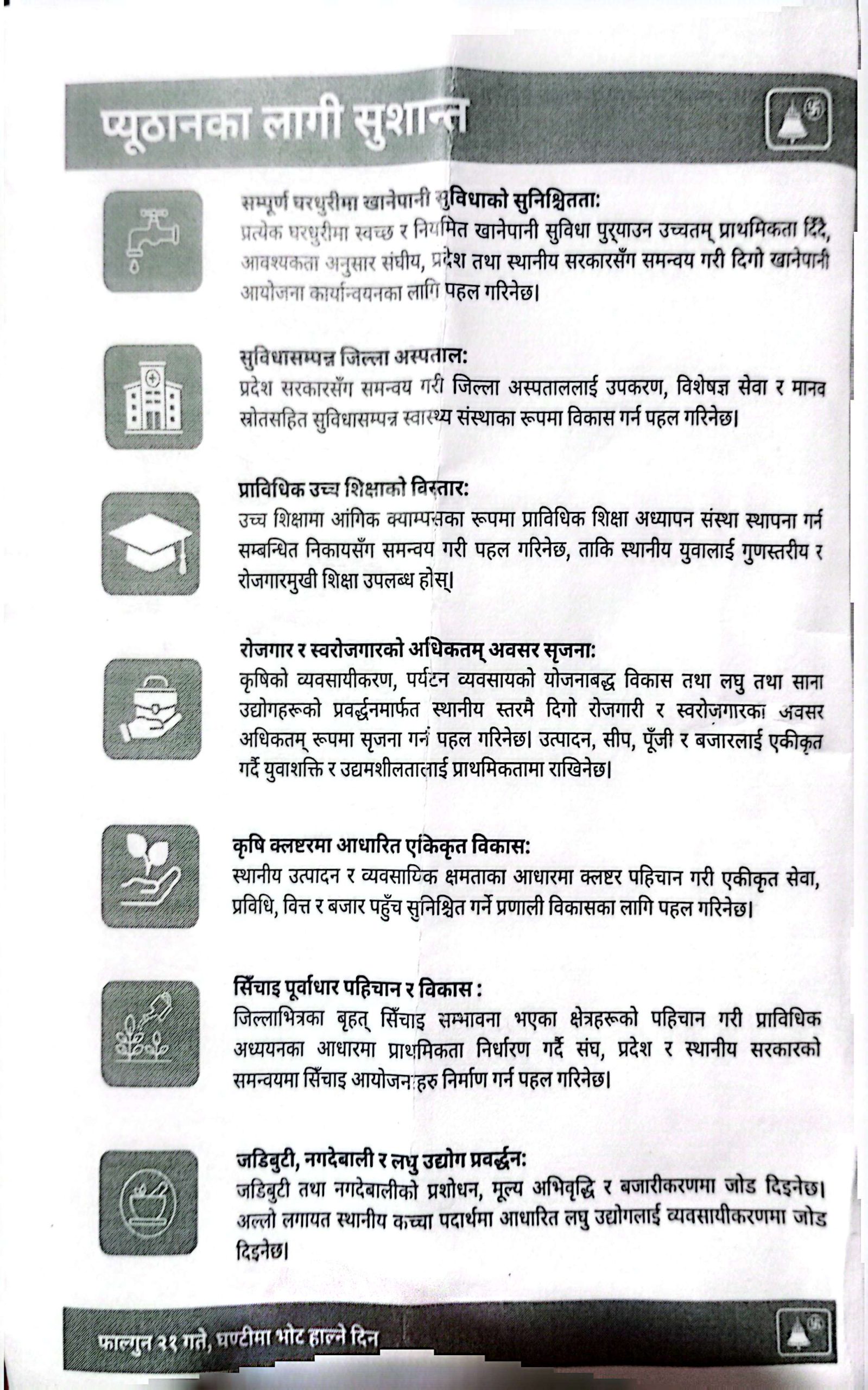 वाचापत्रमा सम्पूर्ण घरमा खानेपानीको सुविधाको सुनिश्चितता, सुविधा सम्पन्न जिल्ला अस्पताल, प्राविधिक उच्च शिक्षाको विस्तार, रोजगार र स्वरोजगारको अधिकतम अवसर सृजना, कृषि क्लष्टरमा आधारित एकिकृत विकासको विषय समेटिएको छ ।