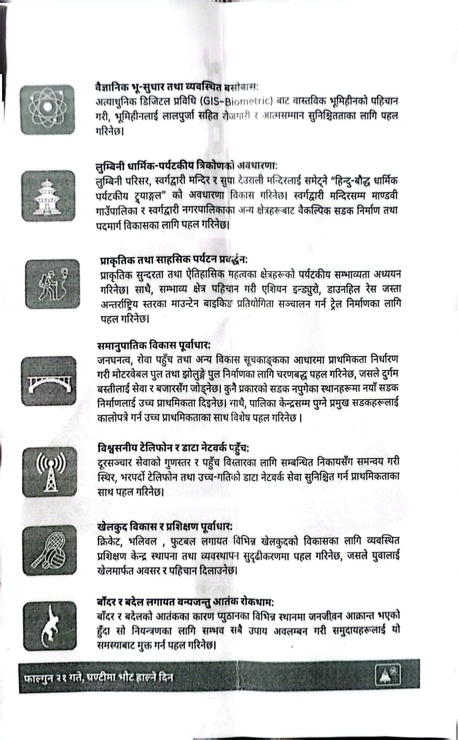 वाचापत्रमा समानुपातिक विकास पुर्वाधार, विश्वसनिय टेलिफोन र डाटा नेटवर्क पहुँच, खेलकुद विकास र प्रशिक्षण पुर्वाधार र बाँदर र बदेल लगायत वन्यजन्तु आतंक रोकथामको विषय समेटिएको छ ।