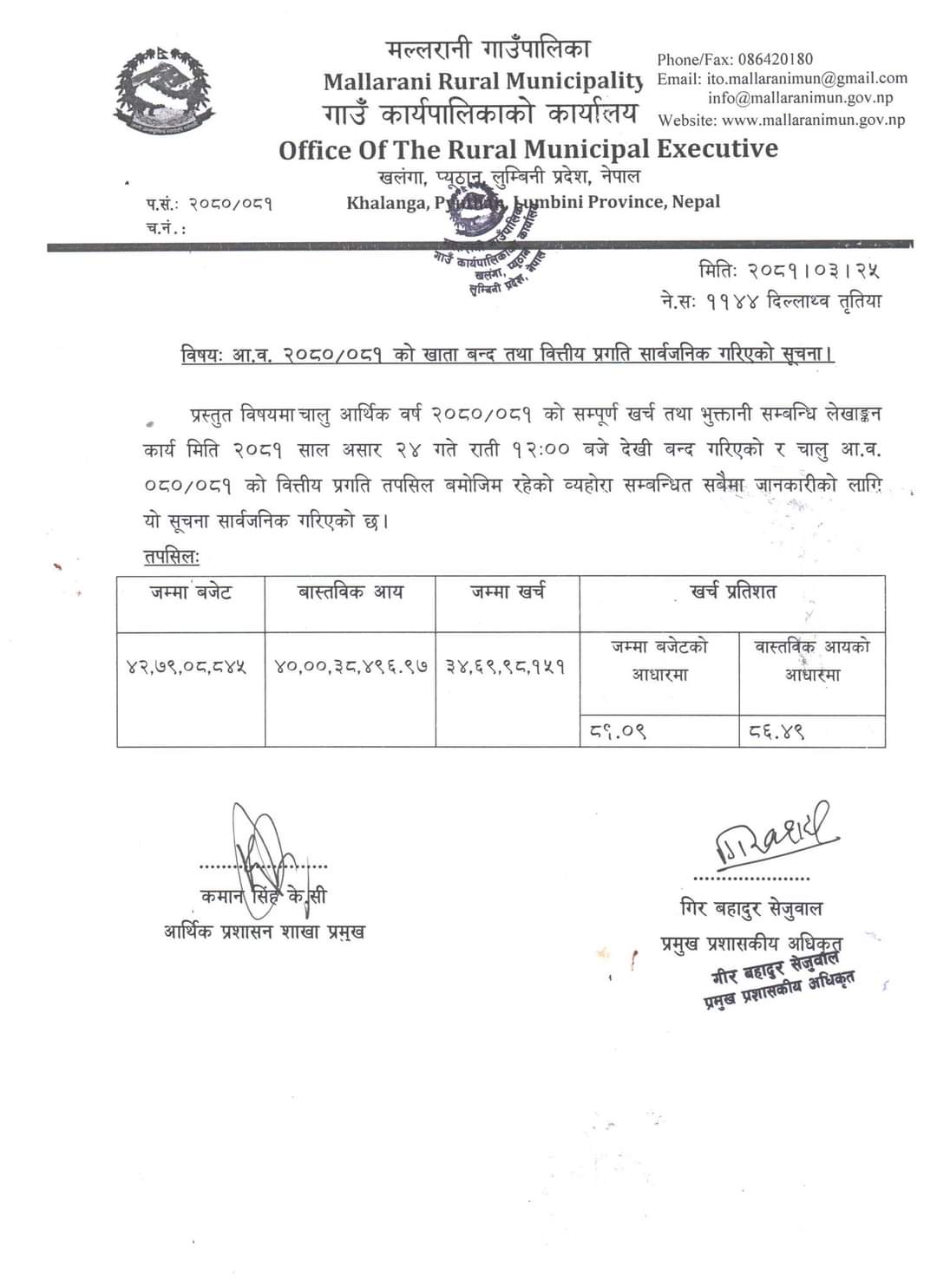 प्यूठान । माण्डवी गाउँपालिकाको चालु आर्थिक वर्षमा ८३.५४ प्रतिशत बजेट खर्च गरेको छ । आर्थिक वर्ष ०८०/०८१ मा ८६.४९ प्रतिशत बजेट खर्च गरेको हो ।