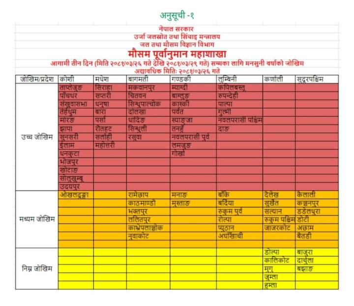 महाशाखाका अनुसार कोशी प्रदेशका १३, मधेशका ८, बागमतीका ७, गण्डकीका ९, लुम्बिनीका ६ जिल्ला उच्च जोखिममा रहेका छन्। आज रातिदेखि मनसुनी न्यूनचापीय रेखा नेपालतिर सर्ने भएको र पश्चिमी न्यून प्रणाली पनि सक्रिय हुने सम्भावना रहेकाले अत्यधिक वर्षा हुन सक्ने महाशाखाले जनाएको छ।