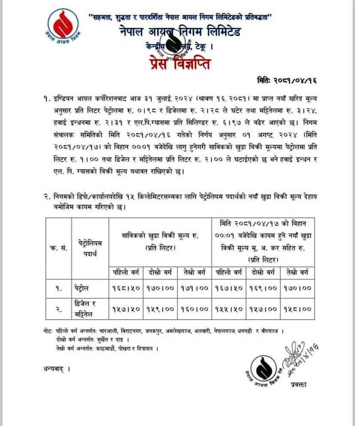 त्यस्तै डिजेल र मट्टितेलको पनि पहिलो वर्गको १ सय ५७ रहेकामा घटेर १ सय ५५ पुगेको जनाएको छ । यसैगरी दोस्रो वर्गको १ सय ५९ रहेकामा घटेर १ सय ५७ पुगेको छ भने तेस्रो वर्गको १ सय ६० रहेकामा घटेर १ सय ५८ पुगेको निगमले जानकारी दिएको छ ।