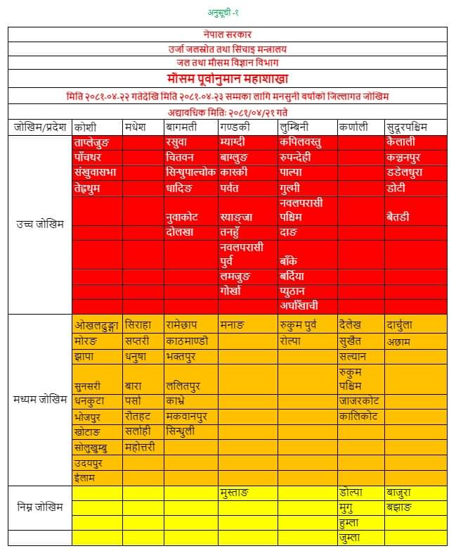 यसैगरी गण्डकी प्रदेशका म्याग्दी, बागलुङ, कास्की, पर्वत, स्याङ्जा, तनहुँ, नवलपरासी पूर्व, लमजुङ र गोरखा जिल्ला पनि अति खतराको रेड जोनमा परेका छन् ।
