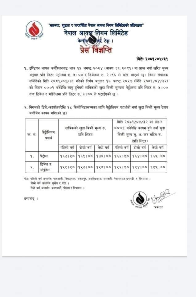 त्यस्तै सुर्खेत र दाङ क्षेत्रमा पेट्रोल प्रतिलिटर १ सय ६४, डिजेल तथा मट्टितेल १ सय ५४ रुपैयाँ कायम भएको छ । काठमाडौं, पोखरा र दिपायल क्षेत्रमा पेट्रोल प्रतिलिटर १ सय ६५ रुपैयाँ र डिजेल तथा मट्टितेल १ सय ५५ रुपैयाँ कायम भएको निगमले एक सूचनामार्फत जानकारी दिएको छ ।