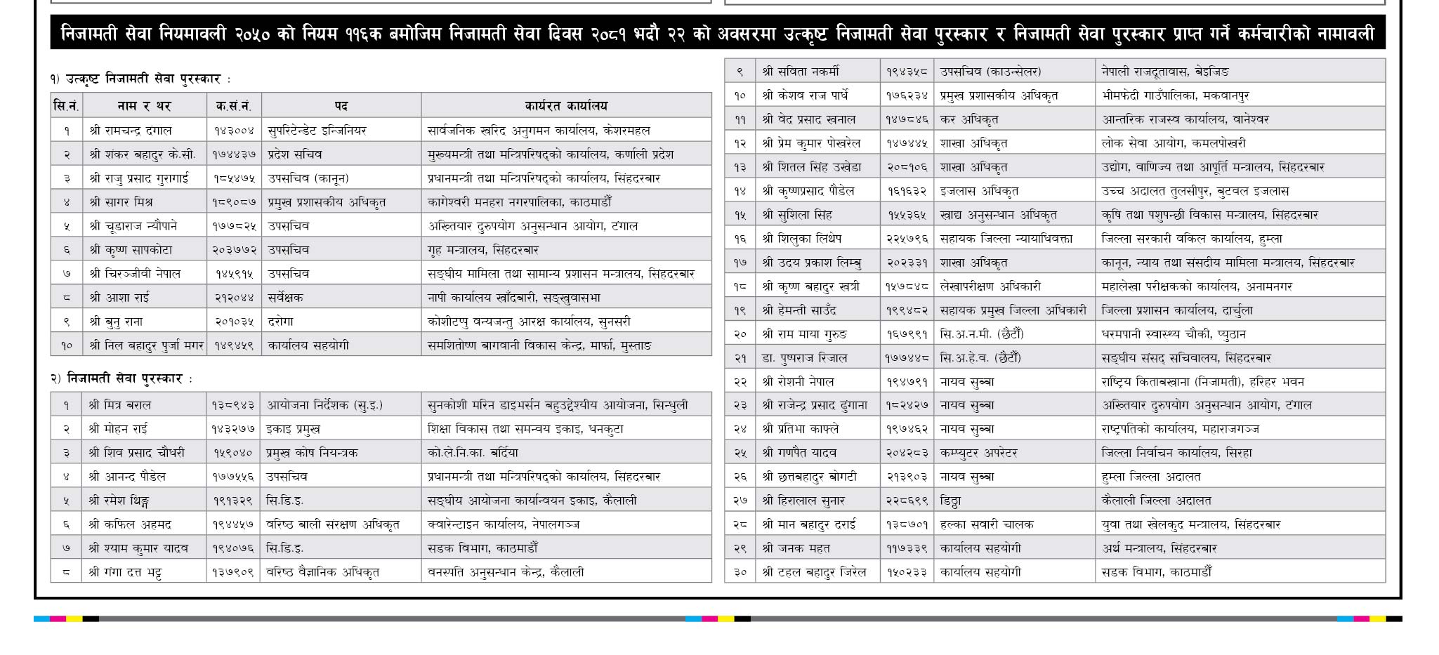 उत्कृष्ट निजामती सेवा पुरस्कार र निजामती सेवा पुरस्कार प्रदान गर्न लागिएको हो । निजामती सेवा पुरस्कारबाट प्यूठानका राममाया गुरुङले पुरस्कार पाउन लाग्नुभएको छ । उहाँ मल्लरानी गाउँपालिका-३ स्थित धरमपानी स्वास्थ्य चौकीमा सिनियर अनमी पदमा कार्यरत हुनुहुन्छ ।