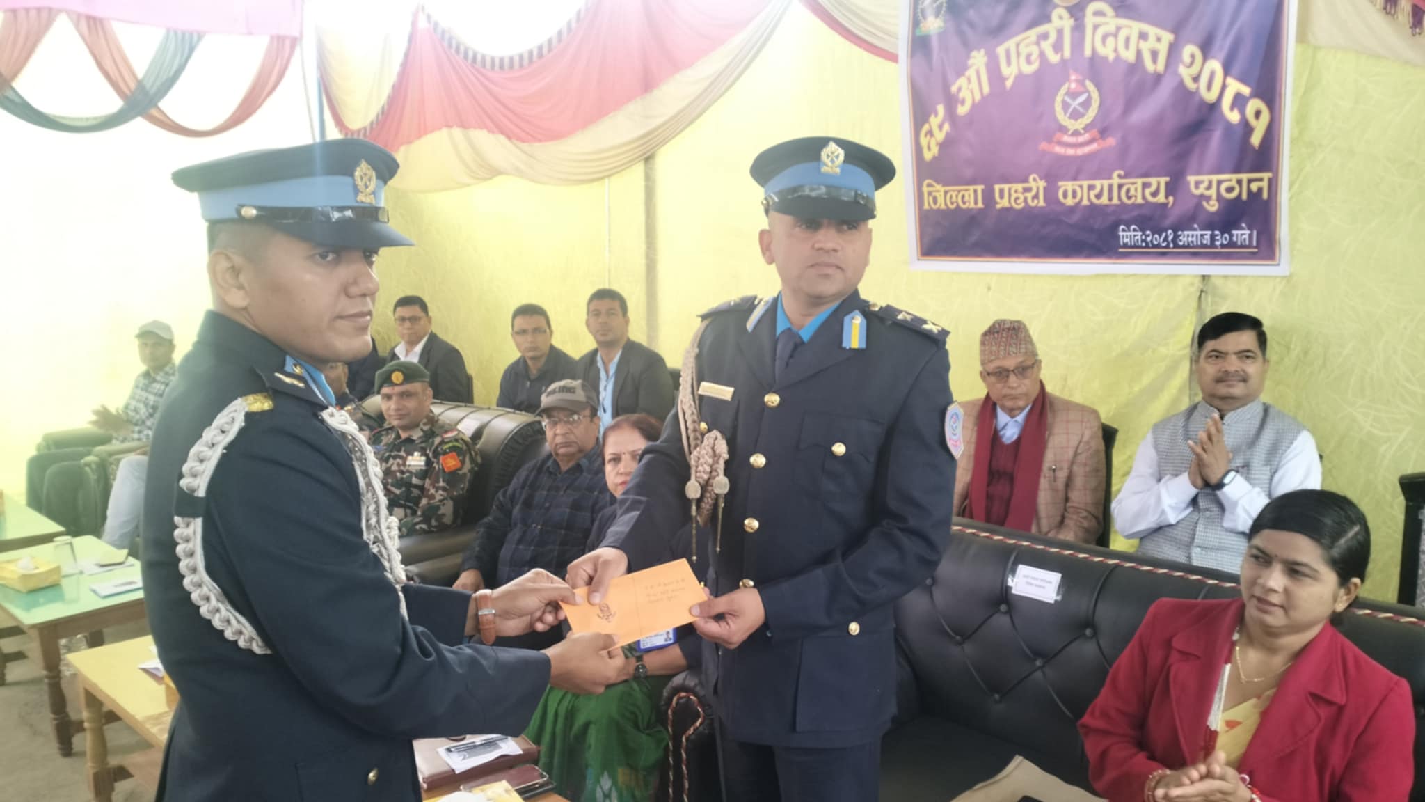 ६९ औं प्रहरी दिवसको अवसरमा जिल्ला प्रहरी कार्यालय प्यूठानले विभिन्न विधामा उत्कृष्ट कार्यसम्पादन गर्ने प्रहरी अधिकृत तथा कर्मचारीहरुलाई नगद पुरस्कार वितरण गरिएको प्रहरी कार्यालय प्यूठानले जनाएकोछ । प्रहरी निरिक्षक केशव केसी, प्रहरी सहायक निरिक्षक योगराज गुरुङ, प्रहरी हवल्दार नविन थापा, प्रहरी सहायक हवल्दार रेनु चौधरी र प्रहरी जवान माधव श्रेष्ठ पुरस्कृत हुनुभएको हो ।