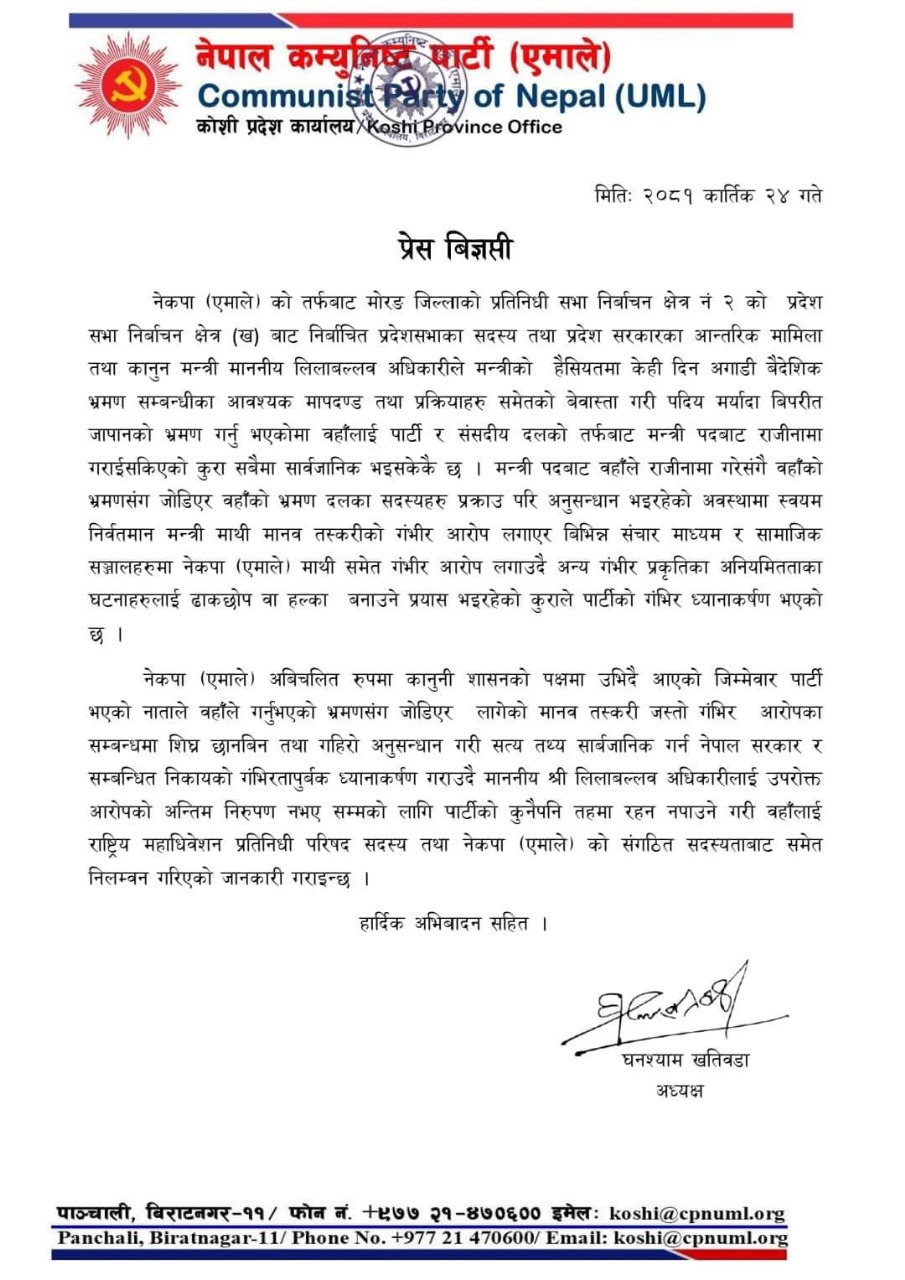 नेकपा एमाले कोशी प्रदेशका अध्यक्ष घनश्याम खतिवडाले शनिबार विज्ञप्ति जारी गरी उहाँलाई पार्टी र संसदीय दलको तर्फबाट मन्त्री पदबाट राजीनामा गराइसकिएको अवस्थामा उहाँको भ्रमणसँग जोडिएका भ्रमण दलका सदस्यहरू पक्राउ परि अनुसन्धान भइरहेको अवस्थामा निवर्तमान मन्त्री माथि मानव तस्करीको गम्भीर आरोप लगाएर विभिन्न सञ्चार माध्यम र सामाजिक सञ्जालहरूमा नेकपा एमाले माथि समेत गम्भीर आरोप लगाउँदै अन्य गम्भीर प्रकृतिका अनियमितताका घटनालाई ढाकछोप वा हल्का बनाउने प्रयास भइरहेको कुराले पार्टीको गम्भीर ध्यानाकर्षण भएको जनाउनुभएको छ ।