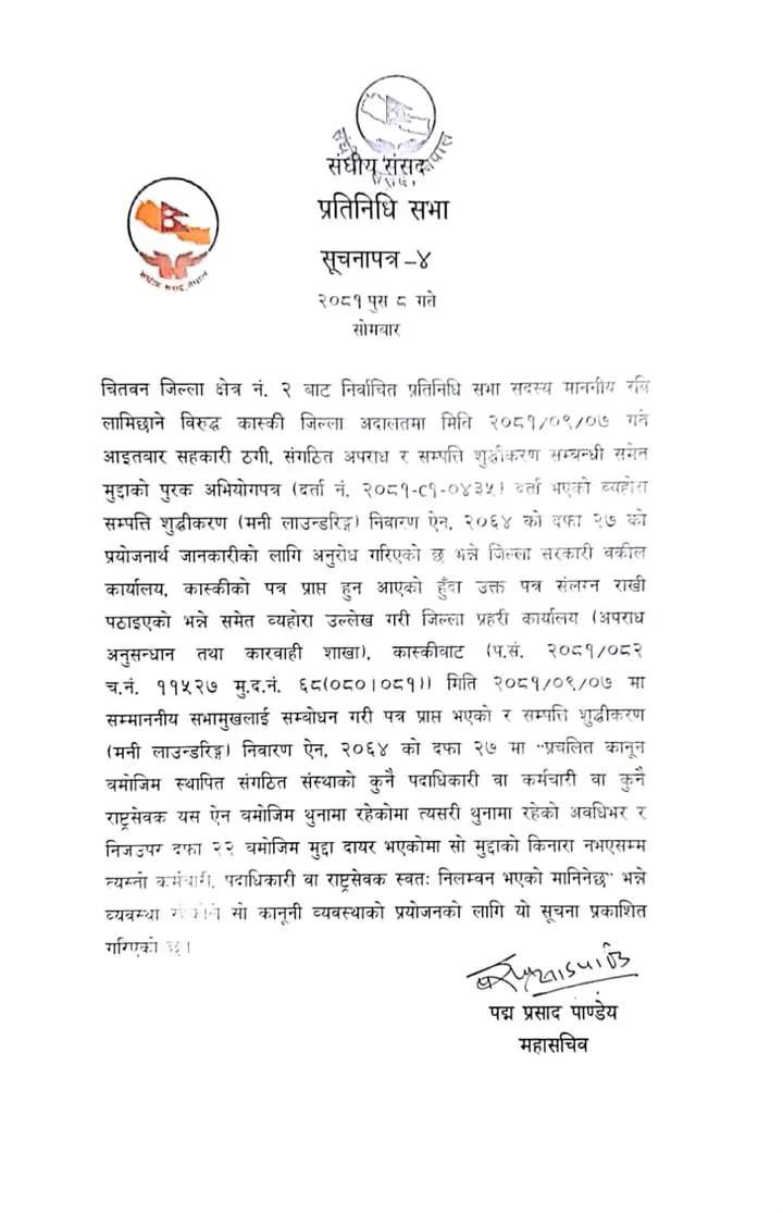 काठमाडौं । राष्ट्रिय स्वतन्त्र पार्टी (रास्वपा) का सभापति रवि लामिछानेको सांसद पद निलम्बन भएको छ । संसद सचिवालयका महासचिव पद्मप्रसाद पाण्डेयले सोमबार सूचना प्रकाशित गरी लामिछानेको पद निलम्बन भएको जानकारी गराउनुभएको हो ।