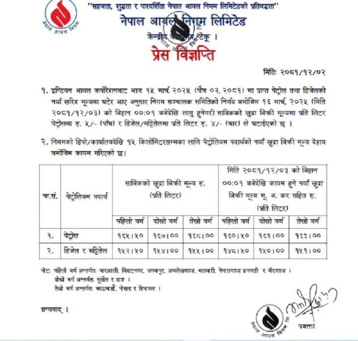 काठमाडौं । नेपाल आयल निगमले पेट्रोलियम पदार्थको मूल्य घटाएको छ । निगमका अनुसार शनिबार राति १२ बजेदेखि लागू हुने गरि पेट्रोलमा प्रतिलिटर पाँच रुपैयाँले मूल्य घटेको जानकारी दिएको हो । त्यस्तै निगमले सार्वजनिक गरेको नयाँ दररेट अनुसार डिजेल र मट्टीतेलमा प्रतिलिटर चार रुपैयाँले मूल्य घटेको जानकारी दिएको छ। नयाँ मूल्य समायोजनअनुसार काठमाडौं उपत्यकामा पेट्रोल १ सय ६३ र डिजेल तथा मट्टीतेल १ सय ५१ रुपैयाँ प्रतिलिटर कायम हुनेछ।